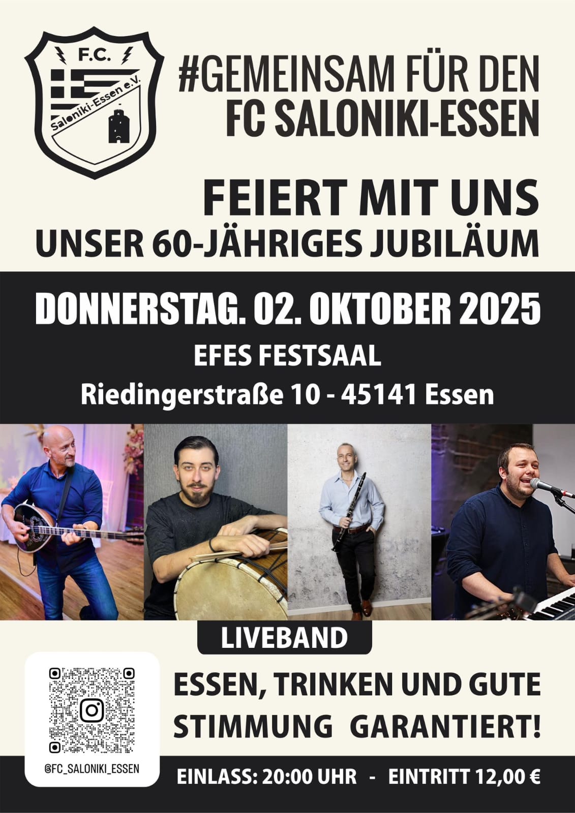 Der FC Saloniki Essen freut sich zur 60 jährigen Jubiläumsfeier auf viele Gäste am 2. Oktober und hofft auf zahlreiche